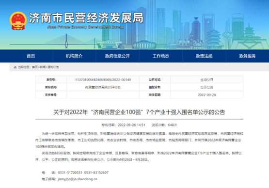 10月20日,济南市民营经济发展局、济南市工商业联合会共同发布“2022年济南民营企业100强”及7个产业十强系列榜单
