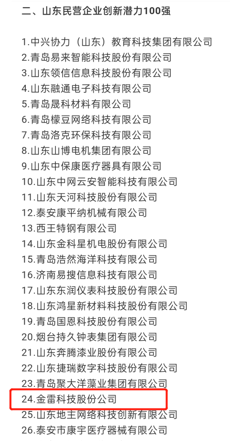 8月27日,山东省工商联十三届八次常委会议暨2021年山东民营企业100强发布会在济南市山东大厦齐鲁厅召开,发布2021山东民企100强、行业领军10强、创新100强、创新潜力100强榜单,公司入选山东民营企业创新潜力100强。